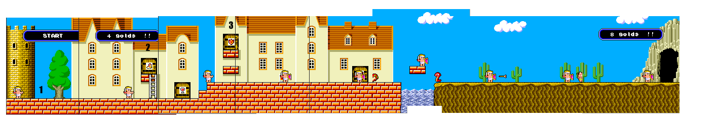 Beim Start gehen wir nach rechts und bei (1) gibt’s 1x Gold. Dann weiter nach rechts bis zum Schuhgeschäft (2). Dort noch nicht rein sondern von der Tür aus nach rechts runterspringen. Gibt 1x Gold. Weiter bis zum Schildgeschäft (3). Einmal von der Tür aus nach rechts runterspringen, dann nach links runterspringen. Gibt jeweils 1x Gold. Dann ins Schildgeschäft gehen und für 40 Gold das Light Shield kaufen. Wenn jetzt noch 80 Gold übrig sind, zum Schuhgeschäft gehen und die Leather Boots kaufen. Wenn nicht, erstmal weiter nach rechts, über das Wasser (da gibt’s ne Sanduhr), die Schlange und den Bogenschützen erledigen. Jetzt sollten eigentlich 80 Gold zusammengekommen sein. Damit zurück zum Schuhgeschäft und die Leather Boots kaufen. Wenn es immer noch nicht reicht, keine Sorge in Sektor C gibt’s noch mal ne Möglichkeit an die Schuhe zu kommen.