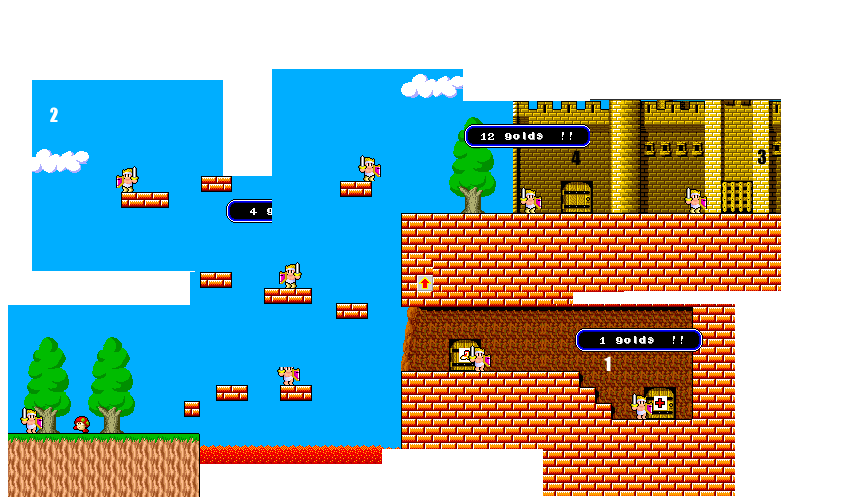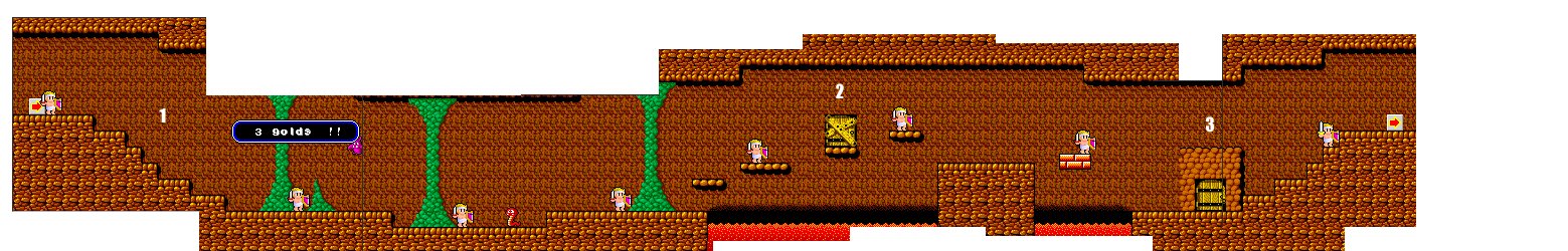 Wir gehen rechts, erledigen den Pilz und springen auf die Plattformen über der Lava. Die rechte Plattform bewegt sich hoch und runter. Da drauf springen und rechts in den Eingang springen. Dort kann man, falls noch nicht geschehen, die Leather Boots kaufen (oder wenn man ganz viel Gold hat und die Leathers schon besitzt, die Legend Boots;-)). Dann weiter nach rechts zur Treppe (1). Dort runterspringen, ergibt 1x Gold. Dort unten kann man auch eine „Cure“ machen. Die füllt die Energie wieder komplett auf. Das kostet anfangs 20 Goldstücke, wird aber mit jeder Cure um 20 Gold teurer. Also wirklich nur anwenden, wenn es energiemäßig richtig brennt.